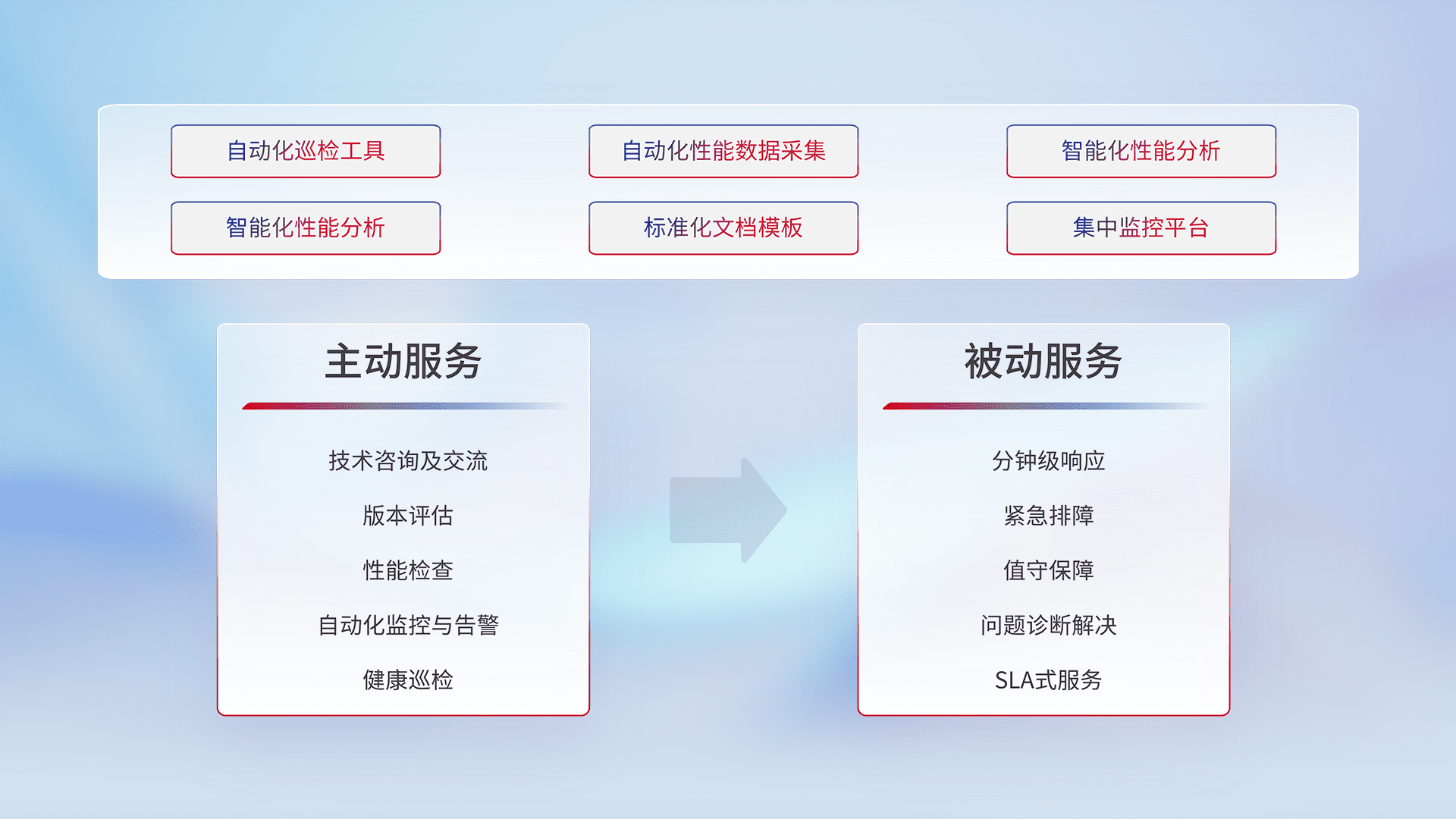 智能化工具和标准化文档,,,,保障服务质量,,,提供主动服务(包含技术咨询、、、版本评估、、、、性能检查、、自动化监控与告警、、健康巡检)和被动服务包含(分钟级响应、、、、紧急排障、、、值守保障、、、问题诊断解决、、SLA服务)。。。