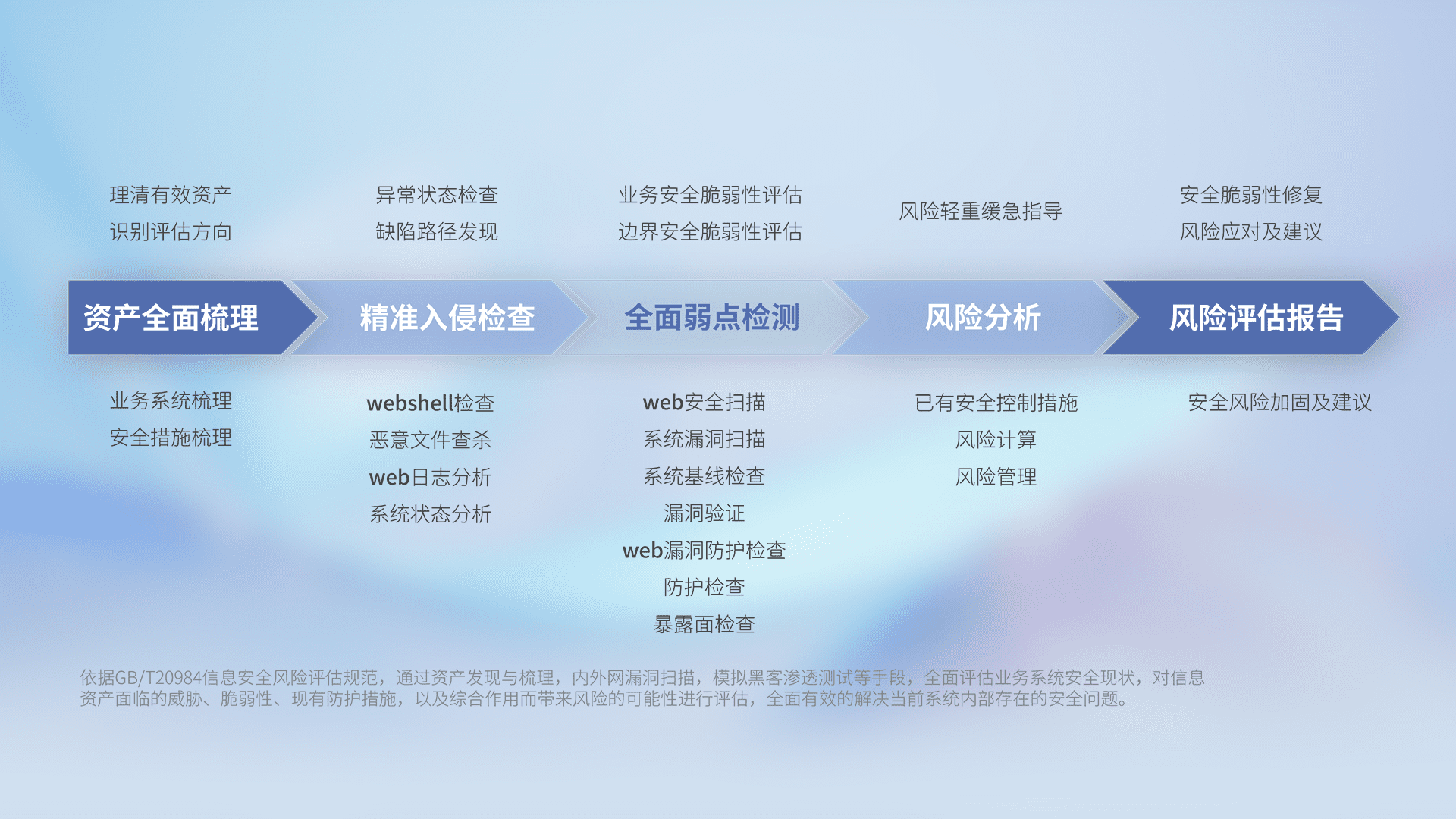 针对客户行业特性,,以专业的安全服务+多厂商联合解决方案提供专属的一站式安全管理服务,,,帮助客户全面感知网络空间威胁,,,基于识别、、、、检测、、、、分析、、防护、、、监测、、、、响应的服务理论模型,,从方案咨询、、、、集成交付、、评估验证、、、、优化加固、、、运维运营,,致力于为客户提供完整的闭环管理式安全服务。。以实战经验为客户打造高抵御风险的安全体系,,帮助客户发现威胁、、、、对抗威胁、、、处置威胁,,不断积累安全对抗能力,,,持续保障数字化安全。。。